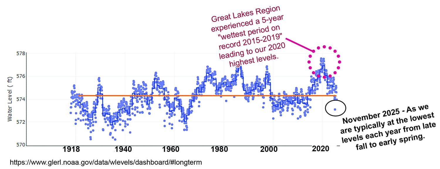 Are lower LAKE ST. CLAIR WATER LEVELS expected for 2026? Despite the significant drop from the 2020 peaks, today’s levels are generally still close to or slightly above the long-term average (1918-present).